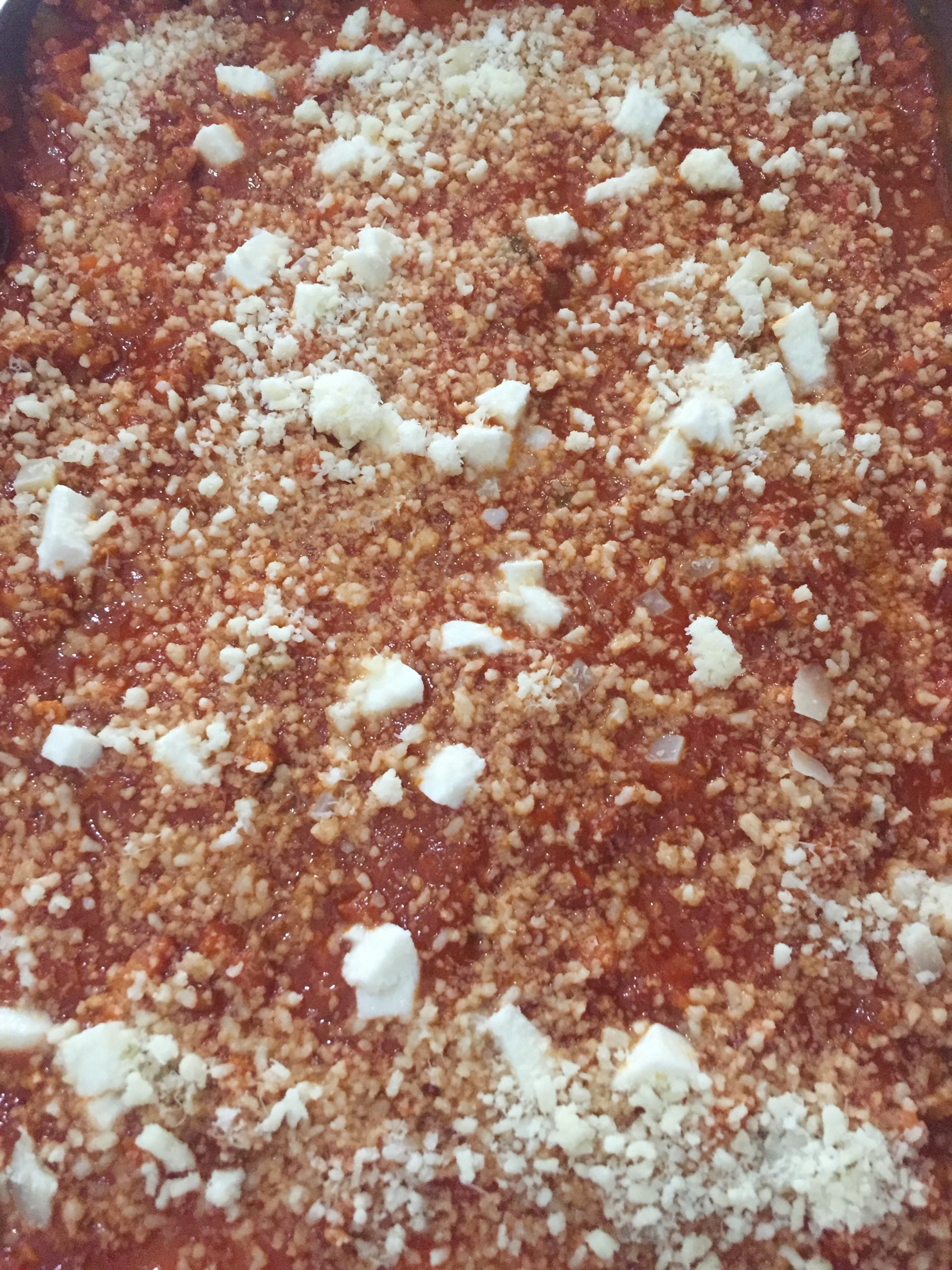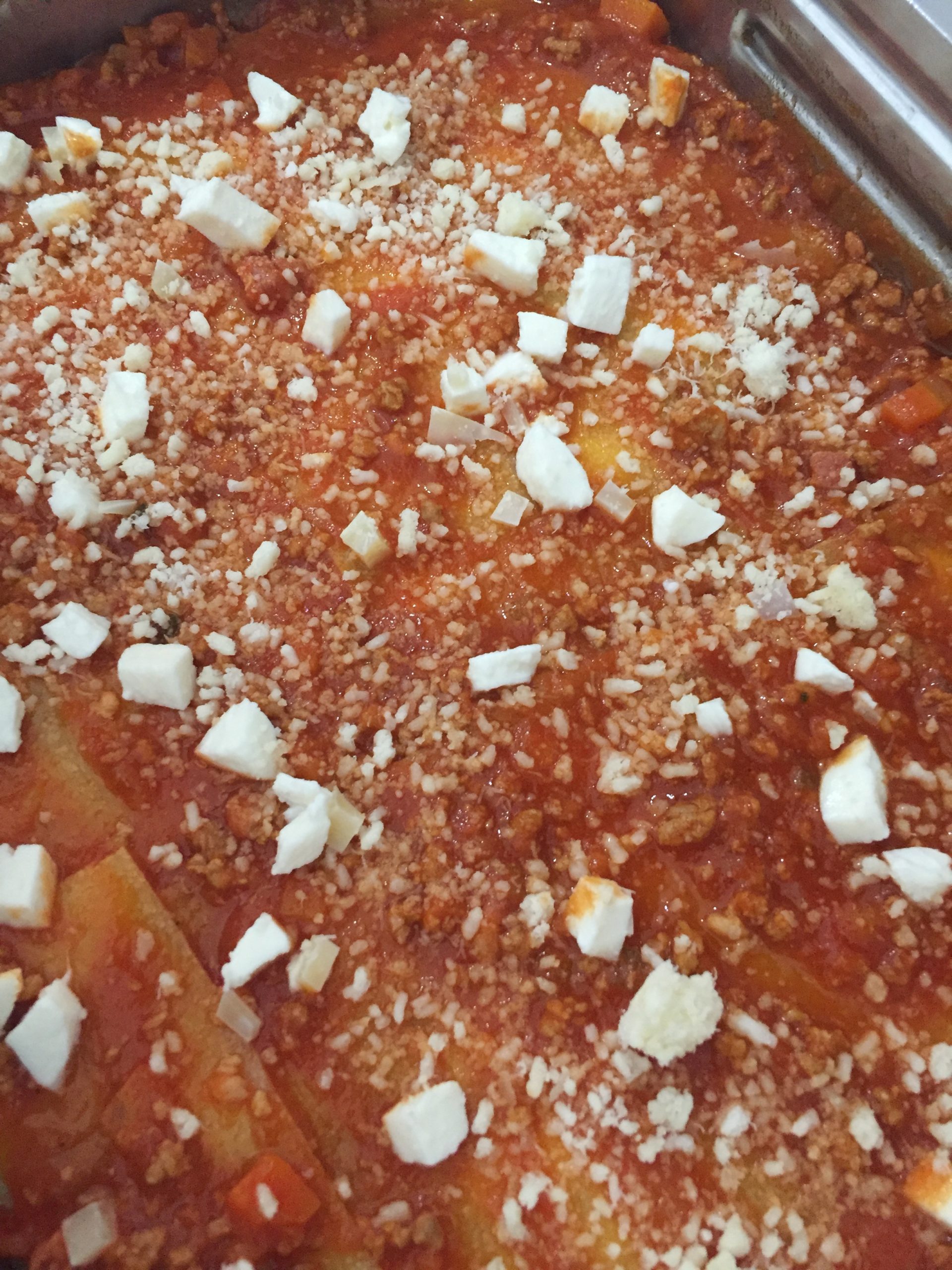 10. Przekładajcie, makaron, sos ( nie za dużo, tylko aby pokryło makaron) posypcie trochę parmezanem i mozzarellą i tak w kółko, powinno wam wyjść 6 poziomów makaronu, na samej górze dodajcie najwiekszą ilość sosu i posypcie obficie parmezanem