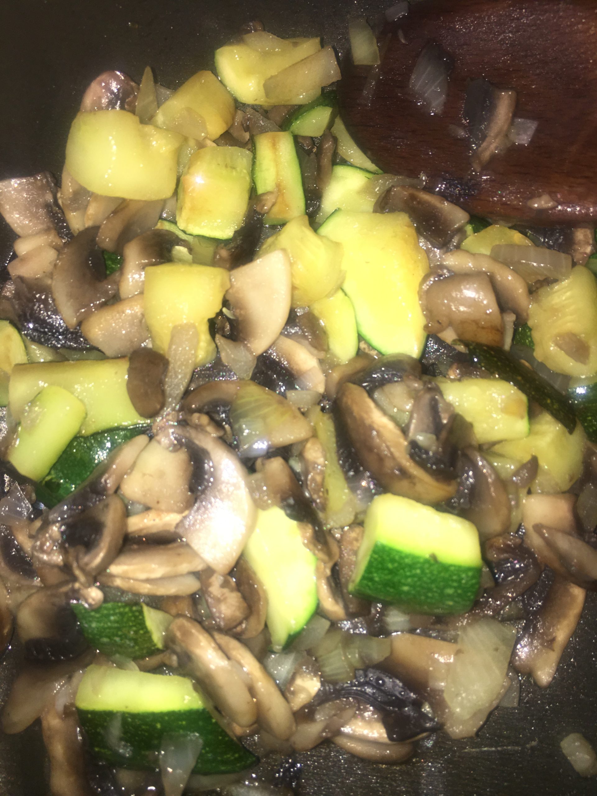 4. Na oliwie z oliwek podsmażamy przez ok 5 min pokrojone pieczarki z cebulką, nastepnie dodajemy wcześniej podsmażoną cukinię, mieszamy 2 minutki i dodajemy pesto