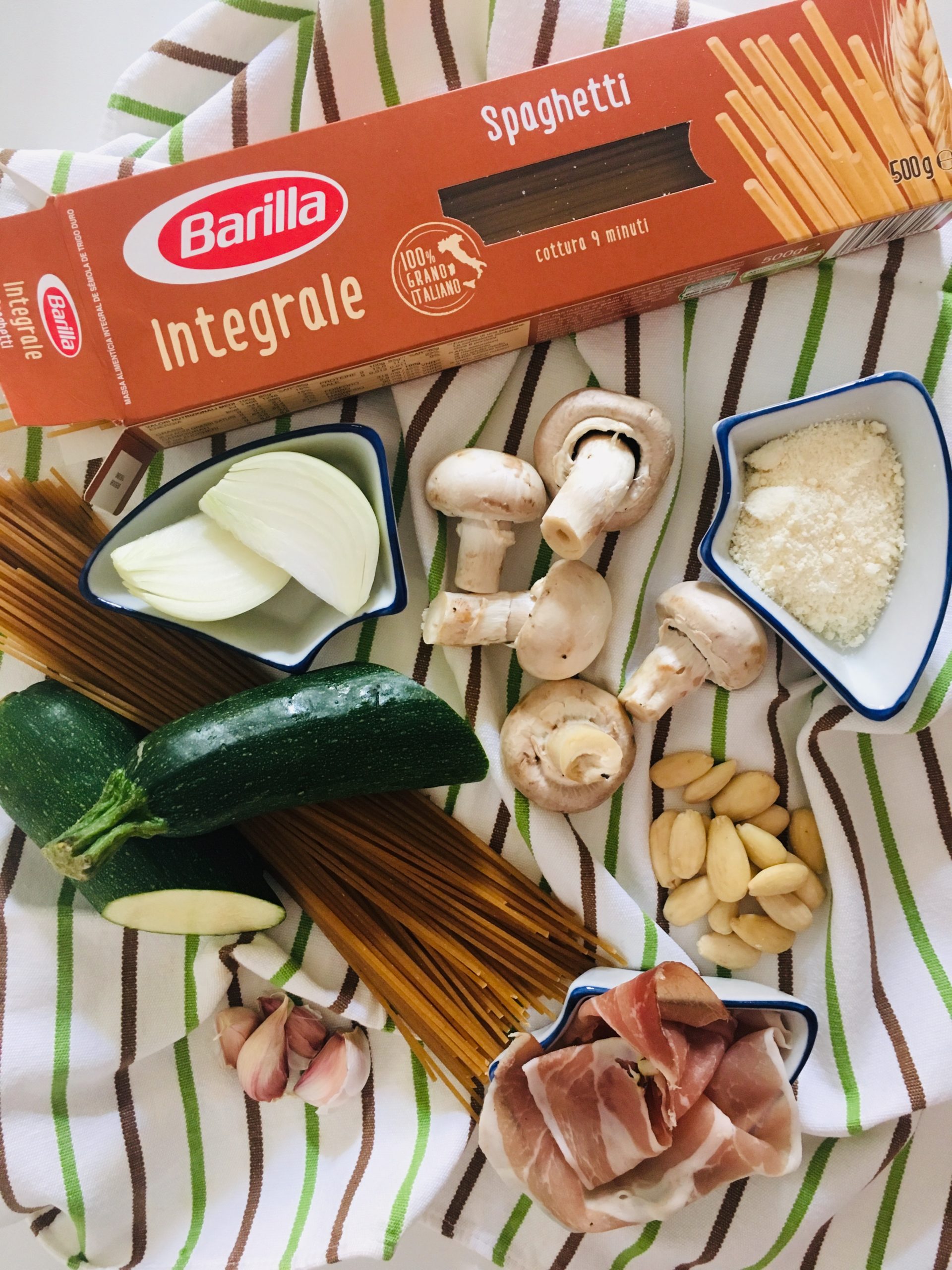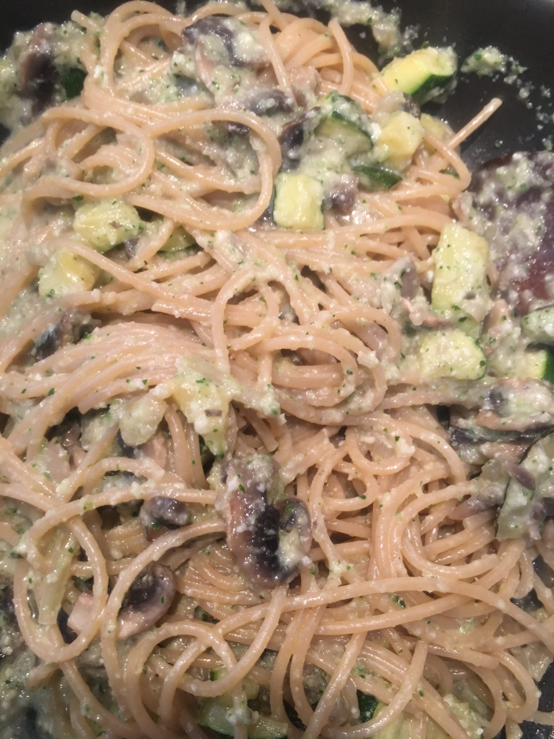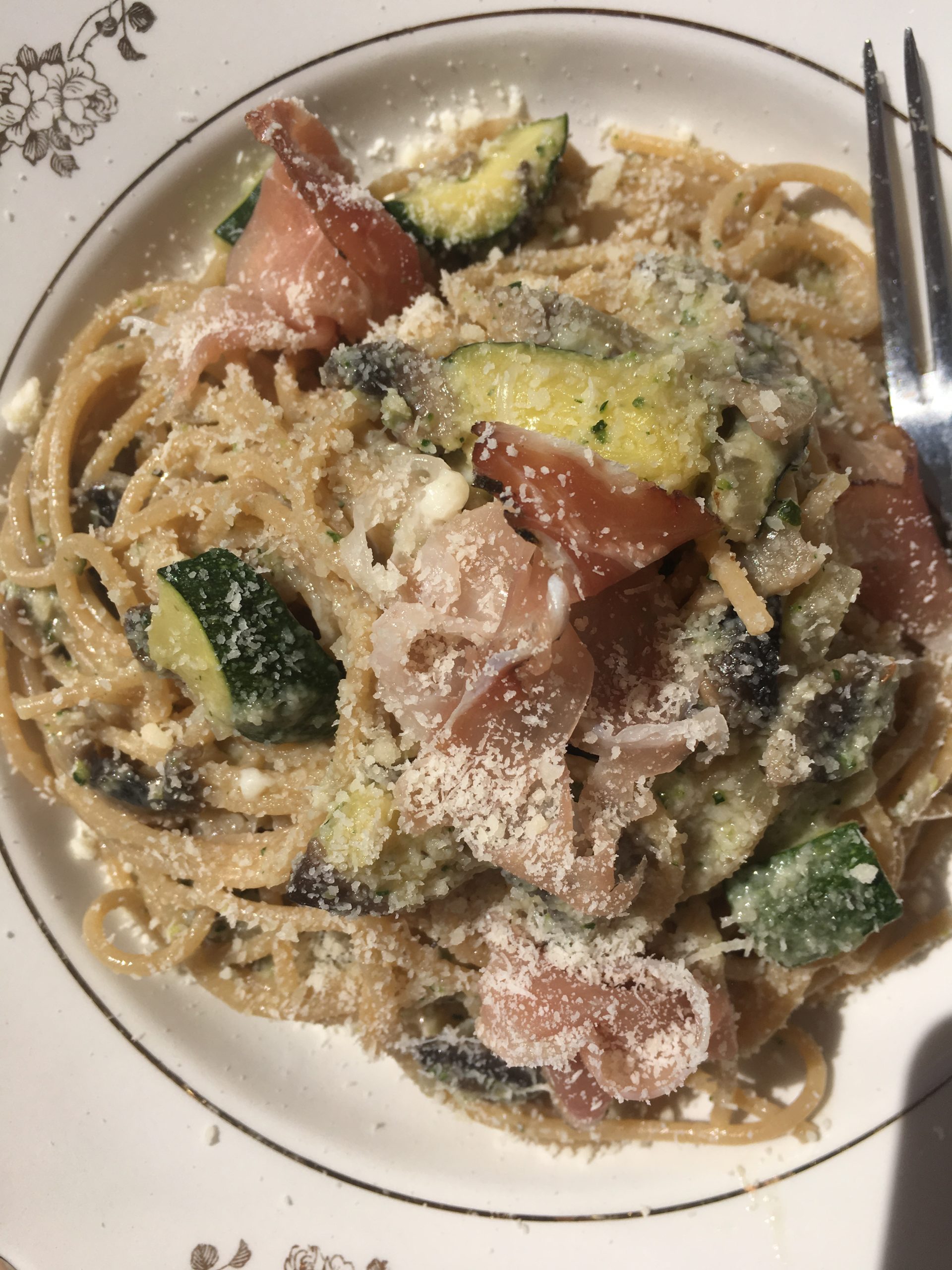 Spaghetti al pesto di zucchine con funghi champignon e speck